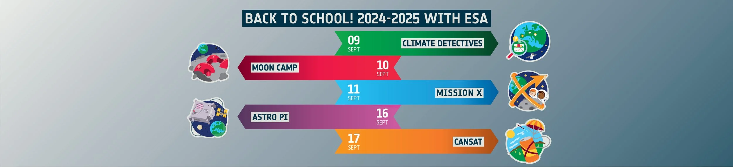 Euroopan avaruusjärjestön kouluprojektit palaavat jälleen syyskuussa 2025. Astro Pi:n, ilmastoetsivien, MissionX:n, Moon Campin ja CanSatin avulla oppilaasi voivat oppia maapallon ympäristöstä, treenata kuin astronautti, suunnitella kuuaseman, kehittää mikrosatelliitin tai ohjelmoida tietokonetta kansainvälisellä avaruusasemalla.