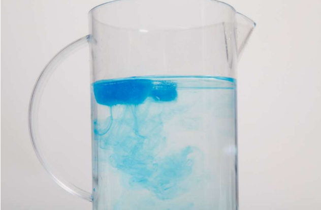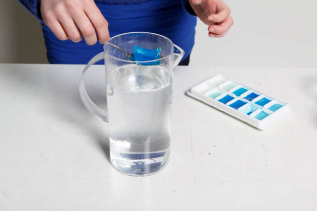 Kaada lämmintä vettä kannuun. Pane värillinen jääkuutio varovasti lusikan avulla veteen.