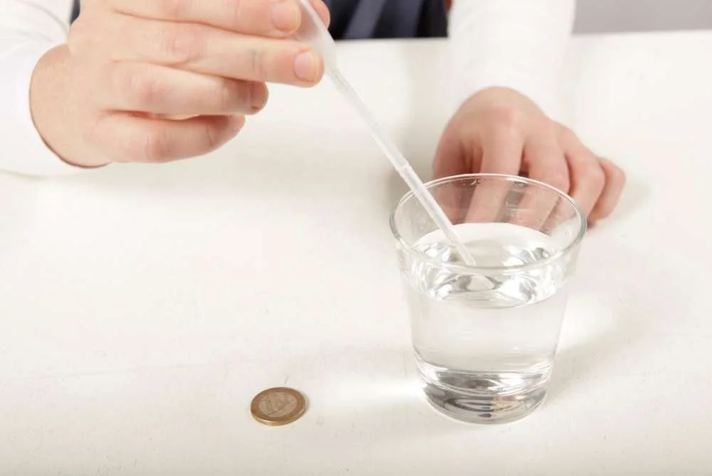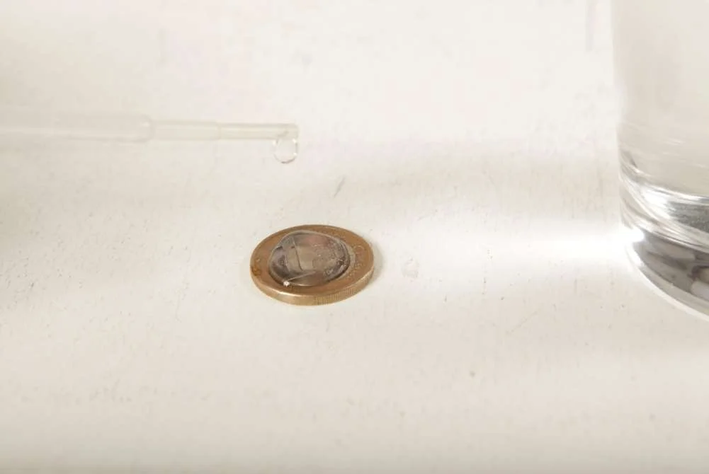 Ota kolikko; 1 euron tai 2 euron kolikko käy hyvin. Ota pipettiin vettä ja pudota vettä pisara kerrallaan kolikon päälle.