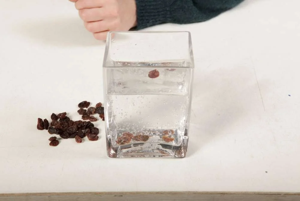 Täytä toinen vesiastia vedellä ja toinen kivennäisvedellä. Kelluvatko rusinat jommassakummassa vedessä? Testaa. Miksi ne kelluvat tai uppoavat? Miksi rusinat liikkuvat edestakaisin kivennäisvedessä? Yrittäkää muotoilla yksi rusina niin, että se kelluu veden pinnalla.
